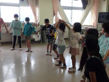 ジェスチャーゲーム、フラフープタイムアタック、大豆移し、目をつむって絵を描く、背中文字リレー、文字並べ、という6つの課題に順番に取り組みました。