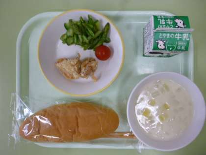 今日の給食は、コッペパン、牛乳、フライドチキン、アスパラサラダ、ビーンズポタージュ、ミニトマトです。
