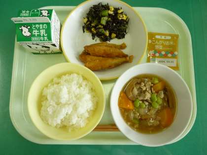 今日の給食は、ごはん、牛乳、わかさぎのフリッター、ひじきのごま和え、冬瓜のそぼろあん、野菜ふりかけです。