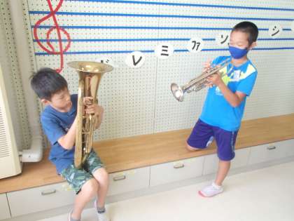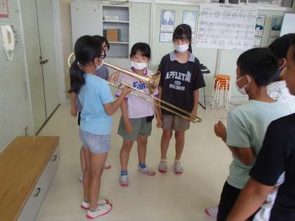 今日は、金管楽器であるトランペット、トロンボーン、チューバを実際に触ってみました。トロンボーンのスライド管を伸ばしたり、ピストンを押してみたりと、子供たちは興味津々でした。