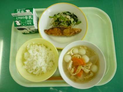 今日の給食は、ごはん、牛乳、魚の竜田あげ、梅肉和え、白玉汁です。