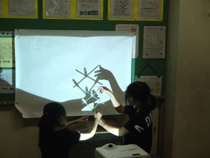 身の回りのものを使って、かげを作りました。怪獣やロケット等、自分の思いに合うように工夫して作っていました。