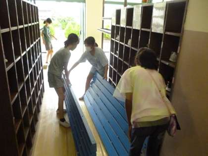 2学期初めての縦割り清掃です。新しい清掃墓所を、みんなで声を掛け合ってきれいにしています。