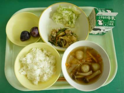 今日の給食は、ごはん、牛乳、豚キムチ丼、ゆでキャベツ、茎わかめスープ、巨峰です。