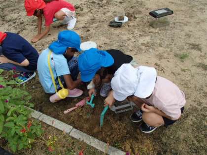 捕まえた後には、飼育ケースに家から持ってきたえさを入れたり、生きものの様子を観察したりしながら、嬉しそうにケースを覗く子供たちの姿が見られました。