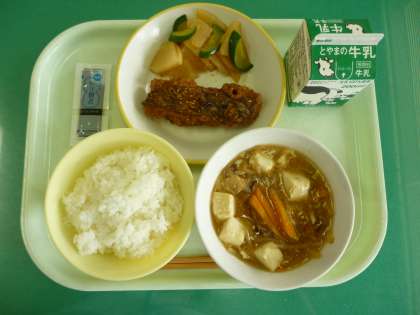 今日の給食は、ごはん、牛乳、魚の利久揚げ、華風和え、豆腐の野菜あんかけ、のり佃煮です。