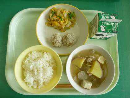 今日の給食は、ごはん、牛乳、珍珠丸子、コーン和え、さつま汁です。