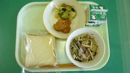 今日の給食は、食パン、牛乳、照り焼きチキン、ビーンズサラダ、ベーコンとひじきの和風スパゲッティです。