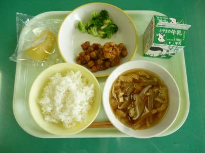 今日の給食は、ごはん、牛乳、鶏肉とひよこの豆からめ、ゆでブロッコリー、沢煮椀、冷凍りんごです。