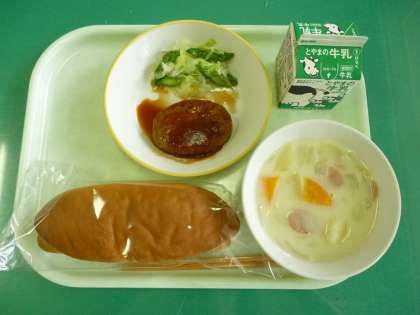 今日の給食は、コッペパン、牛乳、ハンバーグのケチャップ煮、アスパラサラダ、ホワイトシチューです。