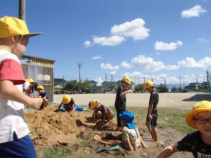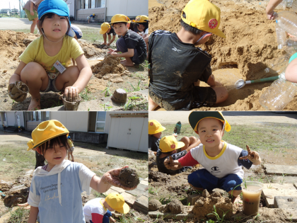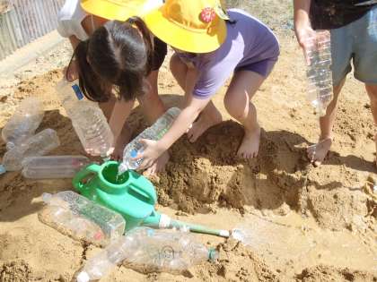 昨日は雨で中止になった生活科でしたが、今日はすっきり晴れた中、楽しみにしていた「土・水となかよし」の学習をできました。今日は、水を運ぶのが大変だったという子供たちが、水を自動で川に注いでくれる装置を考えていました。また、ケーキやお団子、赤ちゃん用のミルク等があるレストランや、川には派川や洞窟も作り始めました。