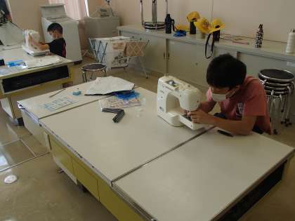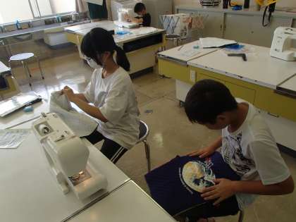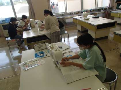 家庭科「思いを形にして生活を豊かに」の学習では、トートバッグ作りをしています。ミシンの使い方を確かめながら丁寧に縫っています。