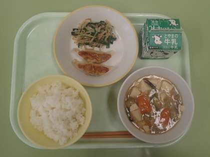 今日の給食は、ごはん、牛乳、焼きぎょうざ、ナムル、えびと豆腐のうま煮でした。