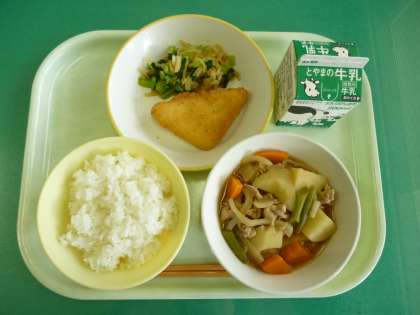 今日の給食は、ごはん、牛乳、はんぺんフライ、はりはり和え、肉じゃがです。