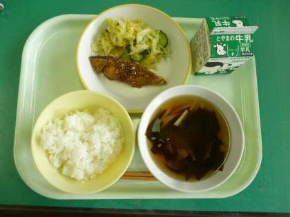 今日の給食は、ごはん、牛乳、マコモタケのお吸い物、フクラギのごまだれかけ、合わせ和えです。