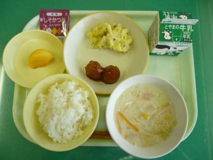 今日の給食は、ごはん、牛乳、ミートボール、チーズおさつ、豆乳野菜スープ、柿、しそかつおふりかけです。
