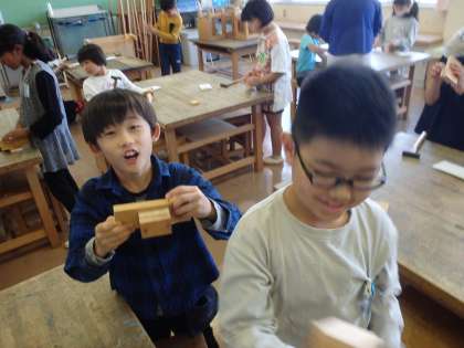 3年生の図工の学習では、木材と釘を使った工作をしています。みんな、楽しみながら学習に取り組んでいました。