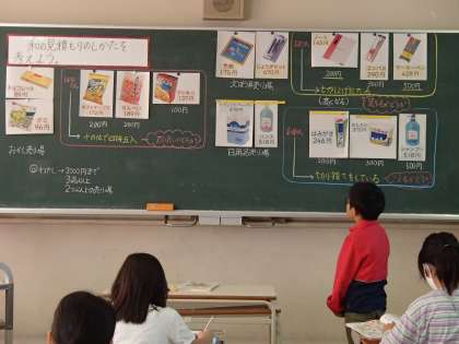 見積もりのしかたについて考えました。四捨五入や切り捨て、切り上げをして計算するとどうなるかについてグループで考えました。最後は自分で商品を選び、どんなものが買えるか考えました。授業が終わった後も、自分が選んだ商品について友達に知らせていました。