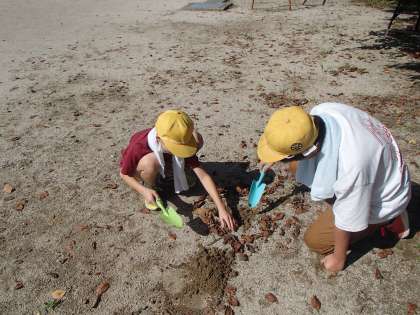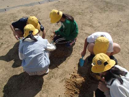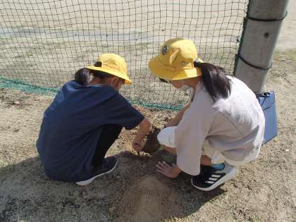 「地面の下はどうなっているの?」という疑問を基に予想を立て、実際に掘ってみました。地面の様子から、地層について興味をもち始めています。