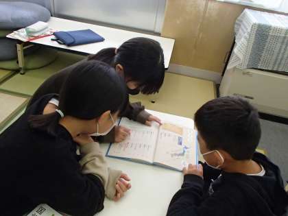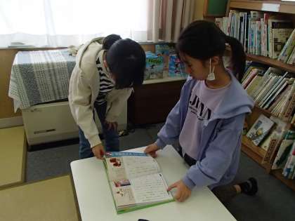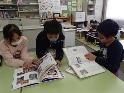 国語科では、これから詳しく調べていきたい伝統工芸について、図書室の本を使って考えました。写真や文章から、興味のあるものを決め、百科事典で調べました。