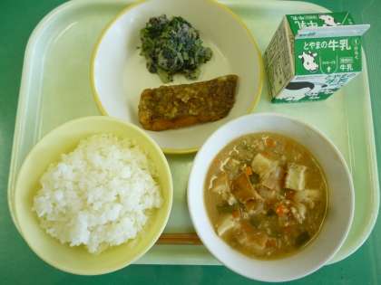 今日の給食は、ごはん、牛乳、揚げ魚のレモン味、よごし、厚揚げのそぼろ煮です。