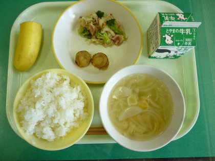 今日の給食は、ごはん、牛乳、ほたてのバターしょうゆ焼き、切干大根のペペロンチーノ、マカロニスープ、バナナです。