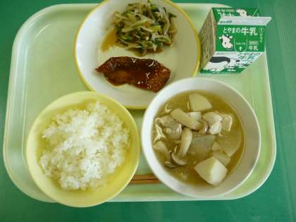 今日の給食は、ごはん、牛乳、赤魚の照り焼き、香味和え、いものこ汁です。