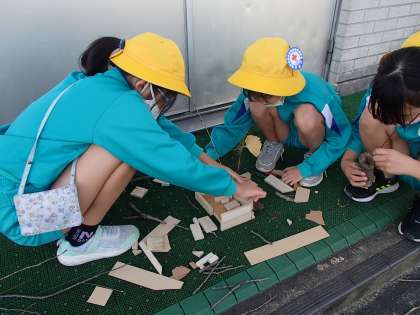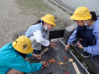 学校のグラウンドに落ちている落ち葉や木の枝、図工で使った材料の残りを使って、ひみつのすみかを作りました。誰が住んでいるのか、どんなものがあったらよいか、みんなで話しながら作っていました。