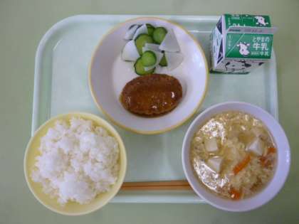 今日の給食は、ごはん、牛乳、和風ハンバーグ、かぶのサラダ、卵と豆腐のスープです。
