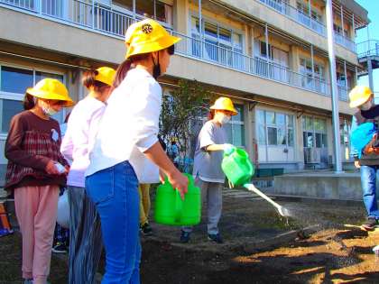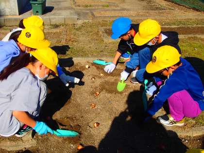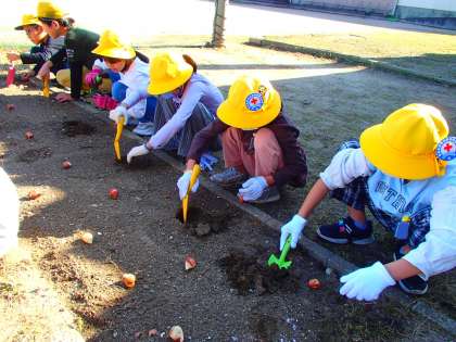 みんなでチューリップの球根を植えました。「卒業式の時にきれいな花を咲かせてほしいな」「来年の春、みんなで写真を撮りたいね」と花が咲くのを楽しみにしている子供たちです。