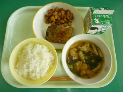 今日の給食は、ごはん、牛乳、魚の甘みそかけ、五目煮豆、うすくず汁です。