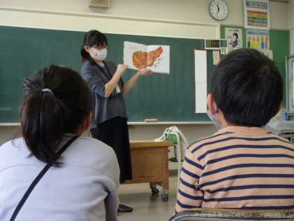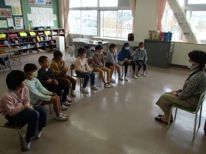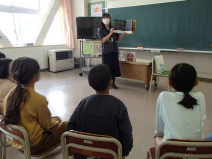 富山市立図書館の訪問授業がありました。何も見ずに言葉だけでお話をするストーリーテリングや、「食欲の秋」にちなんだ本をたくさん紹介するブックトークをしていただきました。プロの読み聞かせに引き込まれる子供たちの表情が、とても印象的でした。