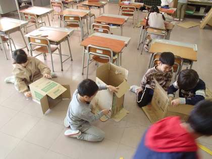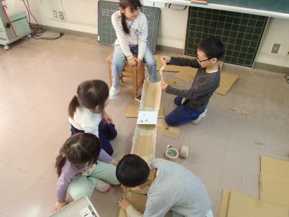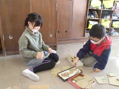 生活科では、先日の校外学習や校庭から持ち帰った秋の実や落ち葉、小枝を使って、おもちゃやアクセサリーなどを作っています。アクセサリーやクリスマスの飾りは、いくつか完成し、廊下の展示台に飾りました。また、ドングリ転がしゲームを考えているチームも、それぞれ楽しそうな遊び方やコースを工夫して作っていました。