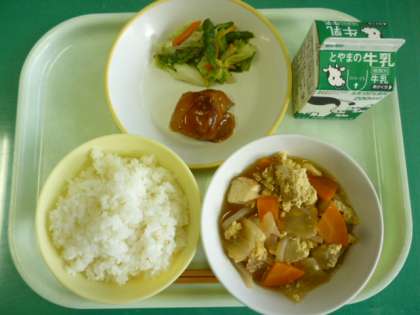 今日の給食は、ごはん、牛乳、照り焼きチキン、野菜ソテー、厚揚げの錦とじです。