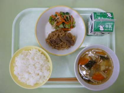 今日の給食は、ごはん、牛乳、ビビンバ(焼肉)、ビビンバ(ナムル)、みそ汁です。
