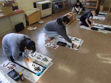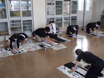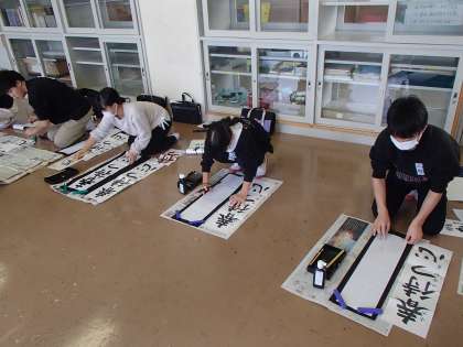 今年の6年生は「春待つ心」を書きます。お手本と見比べながら、字の大きさや線の太さに気を付けて練習しています。