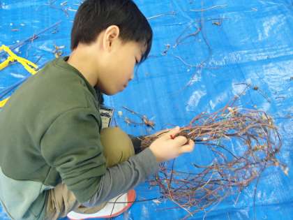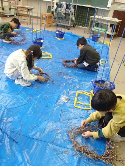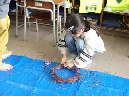 春に種から育てていたアサガオとは、お別れの季節になりました。種がたくさん採れて喜んでいた子供たちでしたが、いざお別れとなると、少し寂しいとつぶやいていました。切った蔓は、円状に束ねて、リースを作ることにしました。