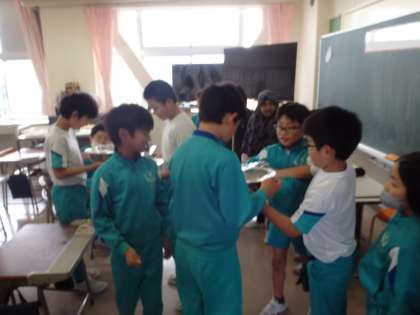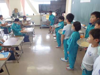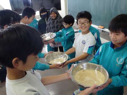 今日は、今までつくってきたきなこを5年生さんに渡しました。おいしいきなこもちにしてほしいという気持ちを伝えていました。