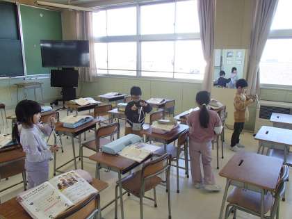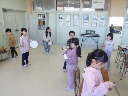 音楽科では、タンバリン、すず、トライアングルから自分の好きな楽器を選び、お気に入りの音を探しました。「サンタさんが来る時の音みたい!」「チャイムの音に似てるよ。」と、いろいろな音を楽しみながら、音楽に合わせて演奏してみました。