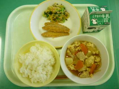今日の給食は、ごはん、牛乳、きびなごのから揚げ、納豆和え、親子煮です。