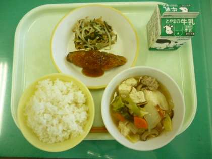 今日の給食は、ごはん、牛乳、揚げ魚のみぞれだれ、昆布和え、はくさいなべです。