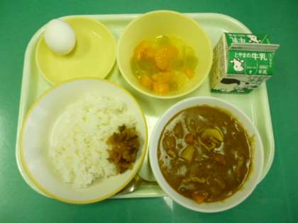 今日の給食は、カレーライス、牛乳、ゆで卵、福神漬、フルーツゼリーミックスです。