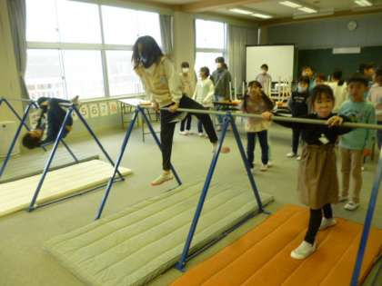 全校運動では、竹馬、ボール投げ、鉄棒をしています。