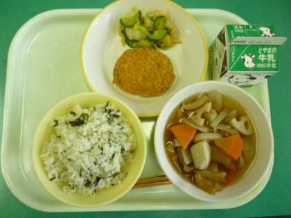 今日の給食は、わかめごはん、牛乳、かぼちゃコロッケ、柚子和え、冬至の根菜汁です。