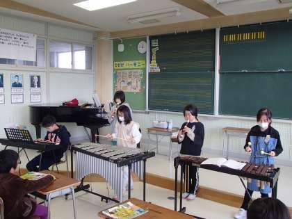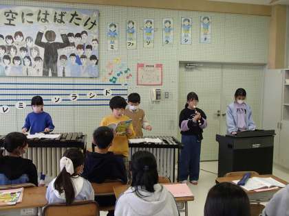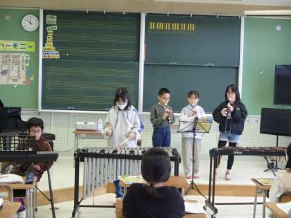 2学期最後の音楽は、今まで練習してきた「茶色のこびん」の合奏をしました。自分たちで相談して、使う楽器や人数を決めました。前奏を入れたり、歌を入れたりと工夫しており、子供たちからは「音がきれいだった」「音がそろっていて、すごいと思った」などの感想がたくさん出ました。
