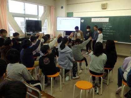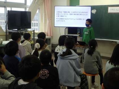 自分たちが取り組んだ米作りや、日本の米と外国の米の違いなど、調べたことや実際に作業したことをクイズなどを交えて4年生に伝えました。