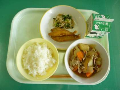 今日の給食は、ごはん、牛乳、わかさぎのフリッター、ごまびたし、豚肉の南蛮煮です。