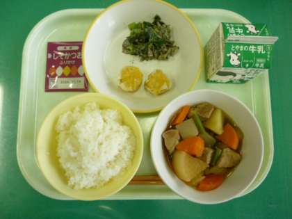 今日の給食は、ごはん、牛乳、にんじんシューマイ、よごし、大根と豚肉の煮込み、ふりかけです。