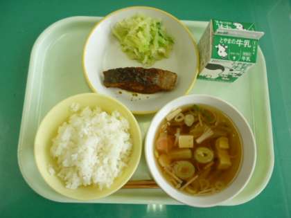 今日の給食は、ごはん、牛乳、魚のえごまだれ、ゆでキャベツ、すいとんです。