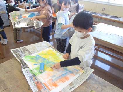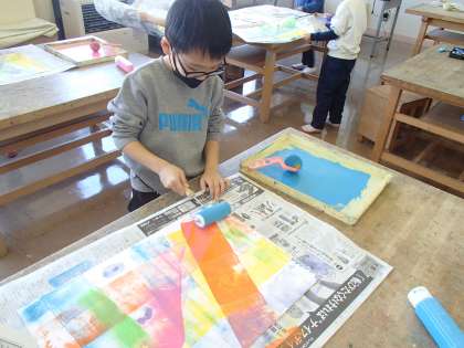 今日は6色のカラフルな絵の具を、ローラーで画用紙いっぱいに広げました。これが、版画の下地になります。どんな絵が完成するか、お楽しみに!